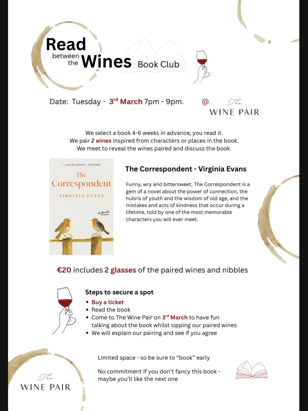 We pair 2 wines inspired from characters or places in the book and we meet to reveal the wines paired and discuss the book over wine and nibbles.